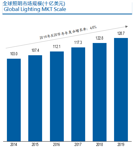 林紀(jì)良先生援引資料表示,全球照明市場(chǎng)整體規(guī)模到2019年預(yù)計(jì)將達(dá)到1287億美元,2014年至2019年年復(fù)合增長(zhǎng)率預(yù)計(jì)達(dá)到4.6%。按產(chǎn)品劃分,全球照明市場(chǎng)可分為通用照明、汽車(chē)照明和背光照明。其中,通用照明為主要產(chǎn)品,占整體全球照明市場(chǎng)總額的80%左右。