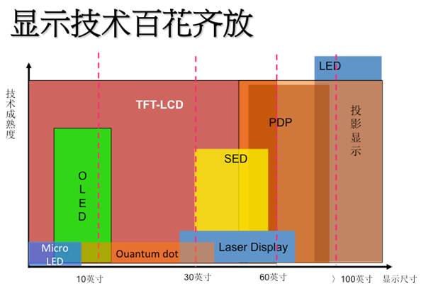 但是人類從來(lái)不是一個(gè)滿足于現(xiàn)狀的動(dòng)物,現(xiàn)在顯示技術(shù)的競(jìng)爭(zhēng)就是如何滿足人類視覺(jué)更苛刻的貪婪要求,于是群雄并起,如圖五所示,主軸是LCD+LED背光與OLED的對(duì)抗,配角是量子點(diǎn),激光顯示與小間距LED顯示屏,LED始終在這場(chǎng)戰(zhàn)爭(zhēng)里當(dāng)配角或隨從的角色,LCD與OLED對(duì)抗,LED是LCD的背光源,本質(zhì)還是LCD與OLED的對(duì)抗,小間距LED顯示屏幾乎只能是這場(chǎng)戰(zhàn)爭(zhēng)里面的配角而已,它要挑戰(zhàn)顯示市場(chǎng)的主流幾乎不可能,它只能在戶外與戶內(nèi)遠(yuǎn)距離觀看的顯示市場(chǎng)有發(fā)揮的空間。
