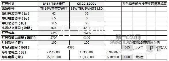 此時(shí),只要對(duì)應(yīng)3*14W的替換型LED燈具的燈具效能高于49.9lm/W,我們就可以說(shuō)它相對(duì)于原來(lái)的格柵燈來(lái)說(shuō)是節(jié)能的。舉例如下: