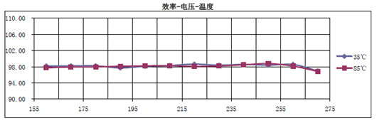 由圖中可以看到,當環境溫度從35度升高到85度時,整個效率隨輸入電壓變化曲線幾乎完全一樣,始終保持在98%以上(包括了整流器的效率在內)。