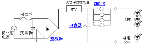 圖中的CRD就是恒流二極管,圖上采用了幾個CRD并聯,以得到所需的恒流值,實際上現在有很多不同恒流值的恒流二極管可供選用,所以也不需要采用并聯的方法來得到所需的恒流值了。所以只要采用一個恒流值相當的恒流二極管和所有LED相串聯就可以實現對LED的恒流供電,可見它的電路是十分簡單的!