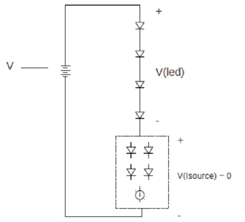 其中方塊中的這部分LED就是可以自適應地接入到主串LED中,也可以從主串中自適應地斷開。接入或斷開的個數由輸入電壓變化的大小而決定。它能感知輸入電壓的變化,并由此來決定LED數目的變化,所以它是自適應的,也可以說是智能的。